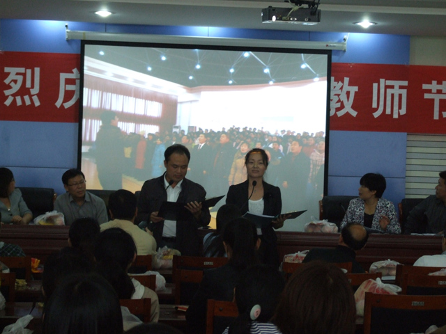 王书记代表学校感谢全体教职员工在过去一年里的辛勤付出,向在座的各位教师表达崇高的敬意并致以节日的祝贺!希望大家志存高远、追求卓越、争做名师、打造名校!李平副校长宣读了对杜银平、宋桂芳等13位优秀教师和先进工作者的表彰决定,勉励他们再接再厉,为学校做出更大的贡献!